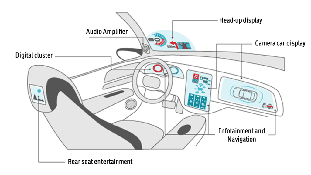 Most of these systems include connecting technologies for video and audio streaming, and communication buses like CAN or Automotive Ethernet.