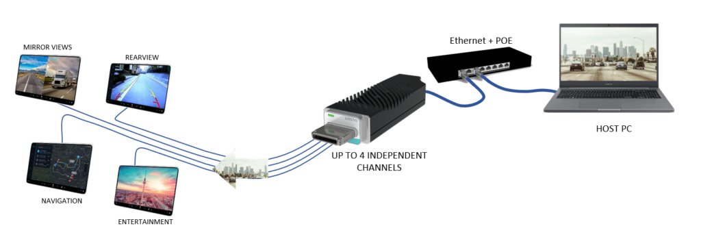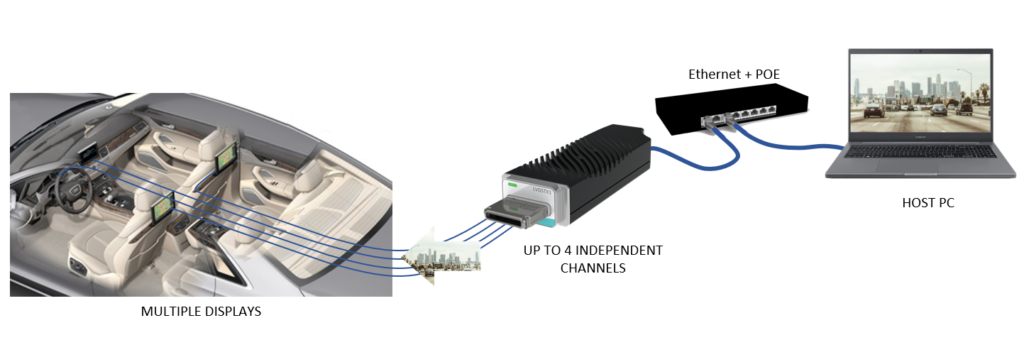 This OpenLDI chipset, integrated in the OpenLDI Generator module, transmits four independent LVDS streams, each of them carrying an independent video stream.